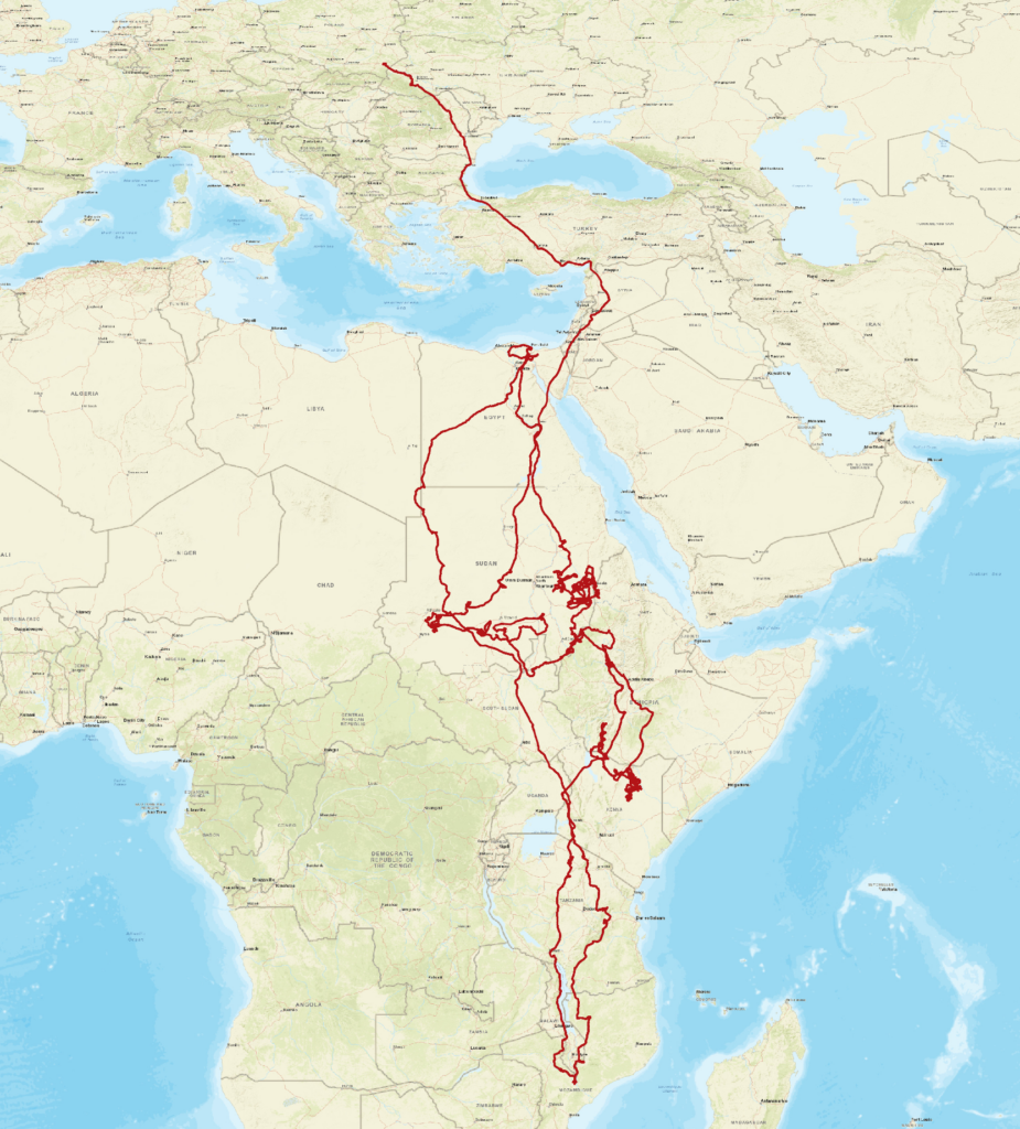 Oprócz obrączkowania ważne jest zakładanie nadjników GPS-GSM. Niestety metoda wciąż bardzo droga ale przynosząca ogromną wiedzę o migracjach ptaków. Na dowód tego pokazujemy mapę przemieszczeń jednego z bocianów z założonym nadajnikiem. Bocian został zaobrączkowany w dniu 01.07.2022 w gnieździe przy ul. Długiej 24a w Przeworsku. Osobnik ten standardowo miał założoną obrączkę metalową oraz plastikową w kolorze zielonym, dającą możliwość odczytu z dalszej odległości. W dniu 05.07.2022 został mu założony nadajnik GPS-GSM a bocian otrzymał imię „Prezes”. Dotychczas nie mamy o nim żadnej wiadomości pochodzącej z odczytu obrączek !!!! „Prezes” w okresie 841 dni swojego życia (stan na dzień 23.10.2024) odwiedził już 10 krajów Czarnego Lądu od Mozambiku i Malawi po Egipt z deltą Nilu włącznie, pokonując przy tym ponad 76 000 km. Jest to pomiar wszystkich przemieszczeń – zarówno w czasie lotu jak i poszukiwania pokarmu na ziemi. Jeśli bocian wznosił się w kominie powietrznym na daną wysokość, przelot taki także był odnotowywany. Oznacza to, że przebyty dystans jest zapewne krótszy, gdyby mierzyć go w linii prostej. Obecnie bocian trzyma się pogranicza etiopsko-kenijskiego.