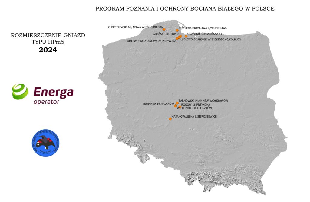 W 2024 roku zaobrączkowaliśmy w obszarze działania Energa Operator łącznie 667 piskląt w 233 gniazdach. Obrączkowanie przeprowadzono na obszarze 39 gmin położonych na obszarze 4 województw. Obrączkowanie możliwe było dzięki Państwa finansowemu wsparciu za które bardzo dziękujemy.