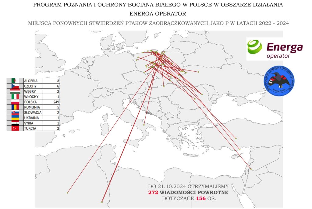 Do 22.10.2024 roku otrzymaliśmy 272 wiadomości powrotne o 156 osobnikach zaobrączkowanych na obszarze działania ENERGA Operator od początku naszej współpracy.