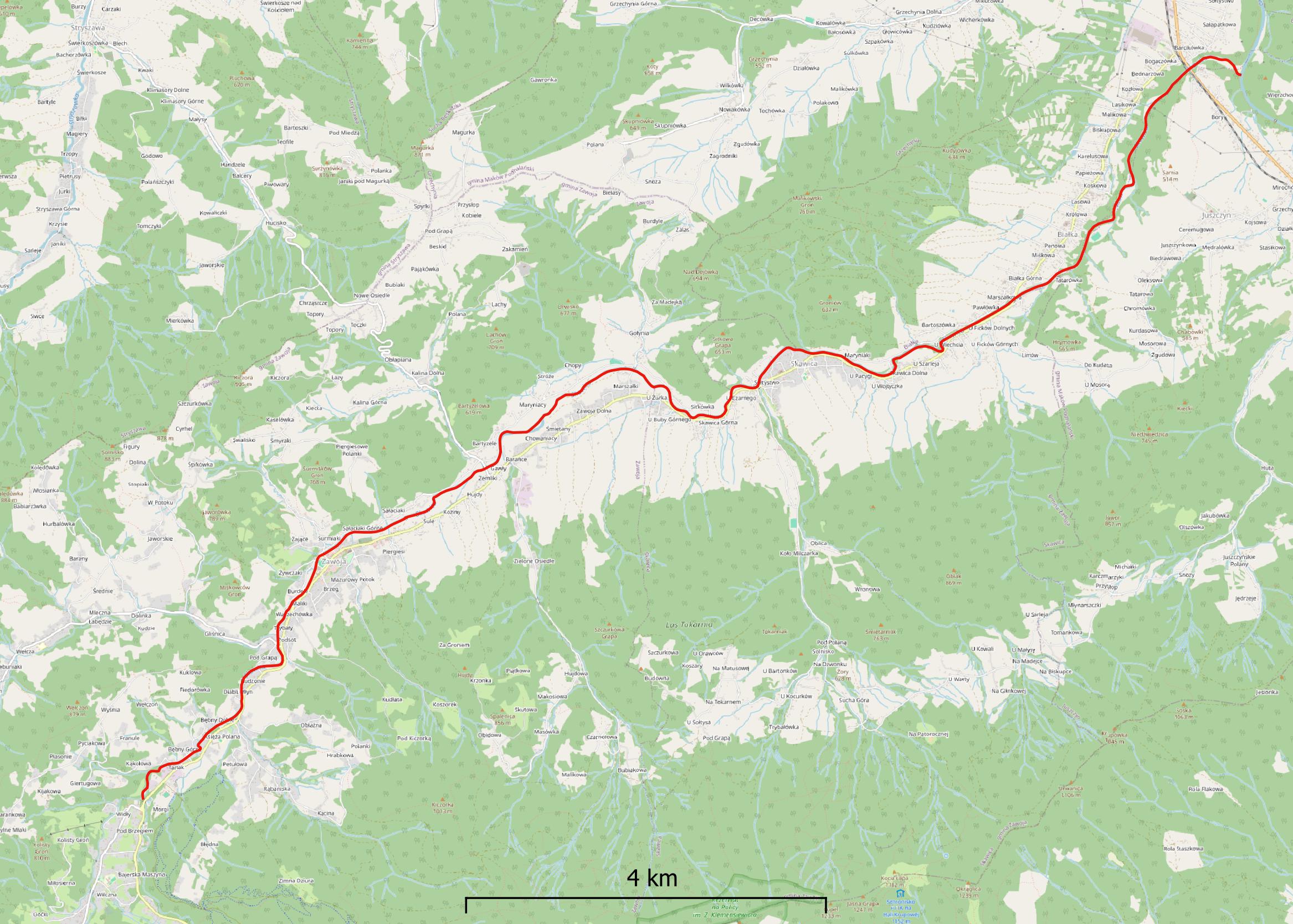 Odcinek Skawicy (18 km), na którym zaplanowano liczenie pluszcza i pliszki górskiej podczas VI. Zjazdu Wiosennego MTO.