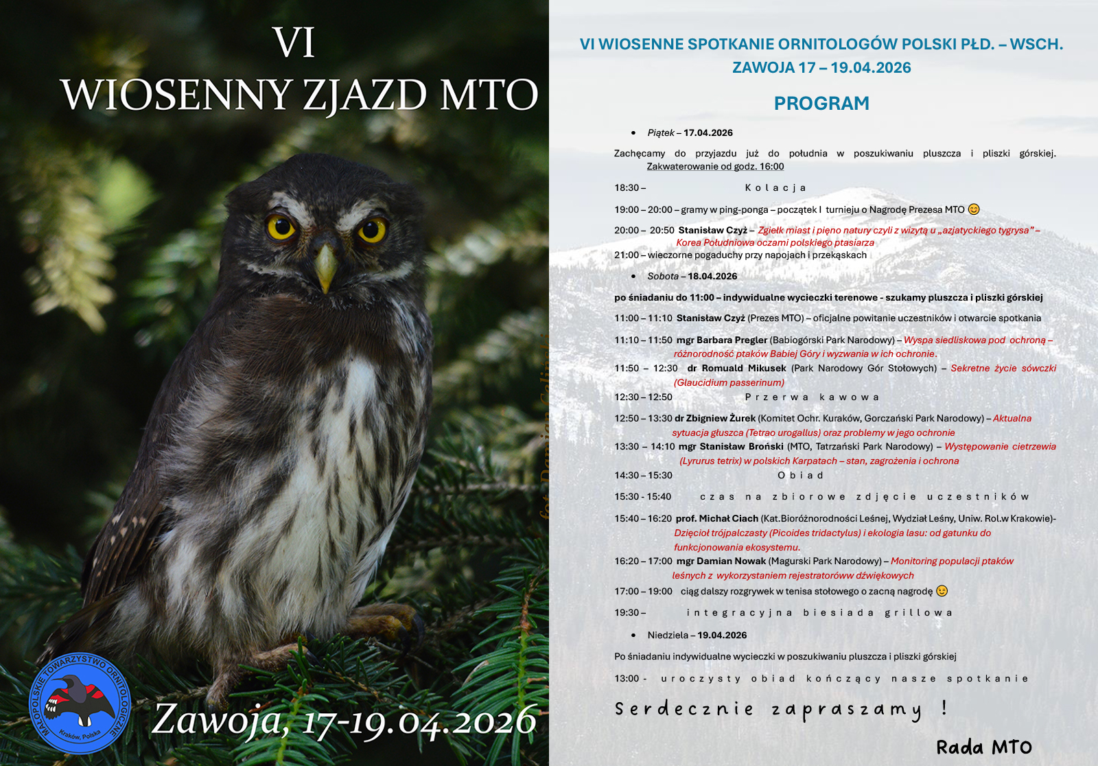 Niebawem zobaczymy się w Zawoi, w Ośrodku Wypoczynkowym „Halny”, na VI. Wiosennym Zjeździe Ornitologów Polski Płd.-Wsch., który odbędzie się w dniach 17-19 kwietnia 2026 r. Poniżej znajduje się długo wyczekiwany program naszego wydarzenia, a ponieważ spotykamy się pod Babią Górą, tematyka referatów jest związana z gatunkami górskimi. Program jest bardzo różnorodny, od sesji złożonej z poważnych wystąpień o charakterze naukowym, po elementy sportowo-rekreacyjne, a nawet biesiadne. Chcielibyśmy zaproponować Państwu jeszcze jeden ciekawy temat w ramach naszego wiosennego spotkania – warto byłoby nasze wyjścia terenowe w piątek, sobotę i niedzielę ukierunkować na wyszukiwanie stanowisk (rewirów) pluszcza (Cinlus cinclus) oraz pliszki górskiej (Motacilla cinerea) na odcinku potoku Skawica (ok. 18 km długości; poniżej mapa). Można skontrolować cały ten odcinek przy pracy w zespołach 2-3 os., dzieląc go na mniejsze, np. 2-kilometrowe, fragmenty. Jeżeli zbierzemy rzetelne dane, jest szansa na ich publikację w nr 11 naszego regionalnego „Pomurnika”, czyli już jesienią. Jeżeli ktoś jest chętny do udziału w takim liczeniu, prosimy o zgłaszanie się z propozycją kontroli jakiegoś odcinka. Dla chętnych roześlemy instrukcję, jak liczyć i notować obserwacje tych gatunków. Uczestnictwo w liczeniach można zgłaszać do Stanisława Czyża na adres mailowy – cygcyg@wp.pl. Prosimy też o wykonanie dokumentacji zdjęciowej do ewentualnego wykorzystania w publikacji . Niestety będzie nas chyba za mało, no i czasu niewiele, aby skontrolować też większe dopływy Skawicy…